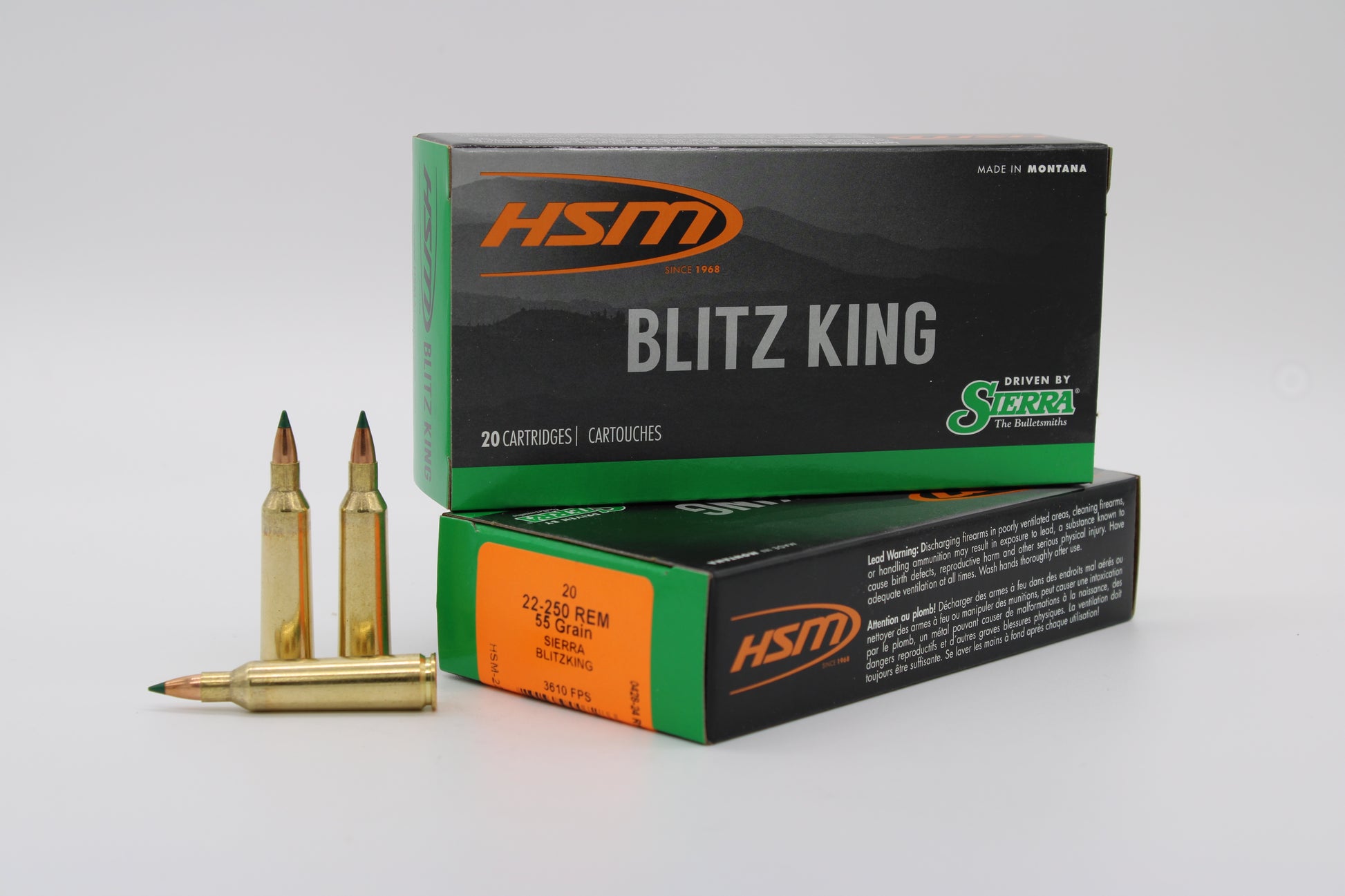 The HSM 22-250 Remington, 55gr BlitzKing is engineered for varmint hunters and precision shooters who demand flat trajectories and explosive performance. With a 55-grain BlitzKing bullet, this load provides outstanding accuracy, rapid expansion, and devastating terminal performance, making it ideal for small game and varmint hunting.